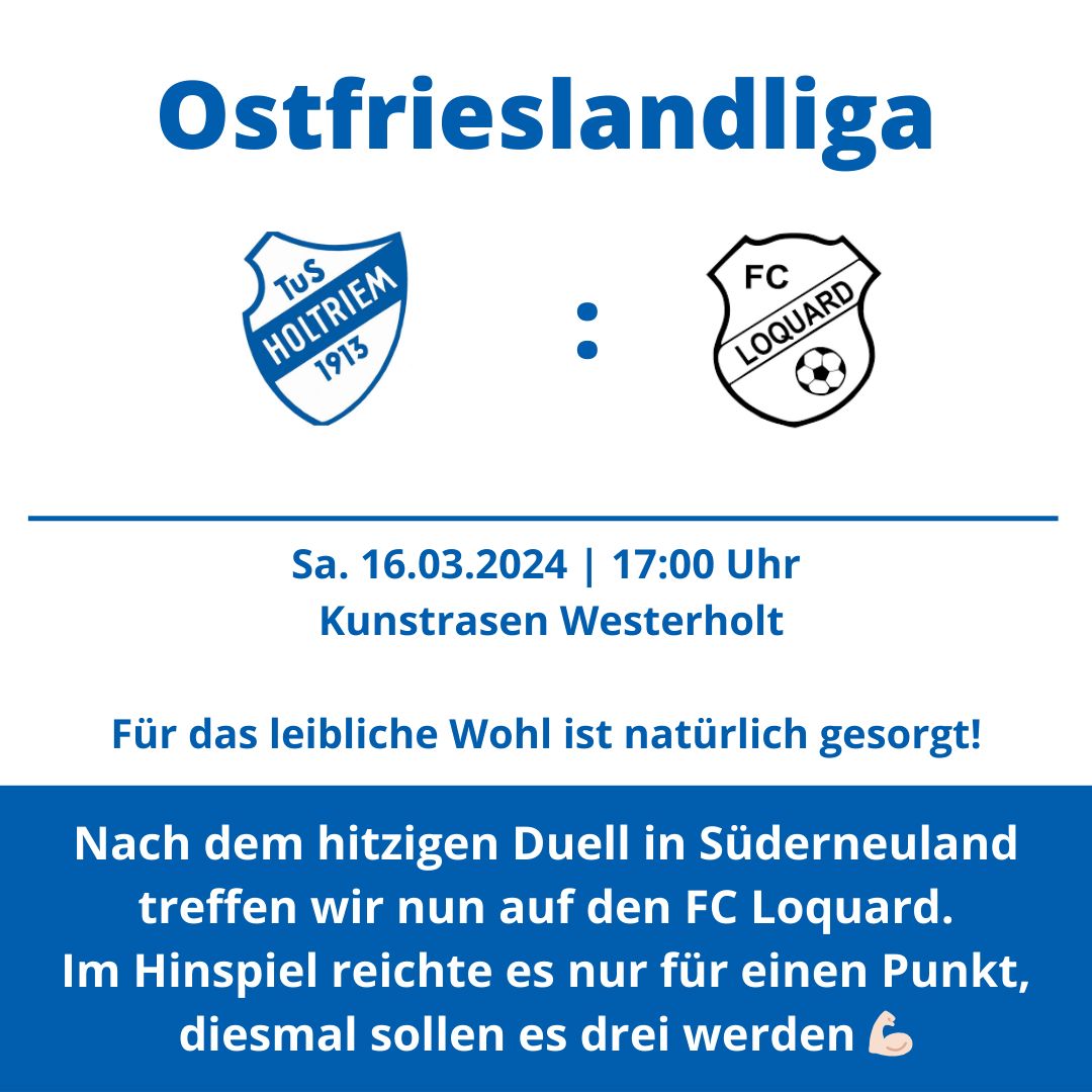 Am Samstag, den 16.03.2024 empfängt der TuS Holtriem um 17:00 Uhr das nächste Team aus der Krummhörn; zu Gast in Westerholt ist diesmal der FC Loquard.