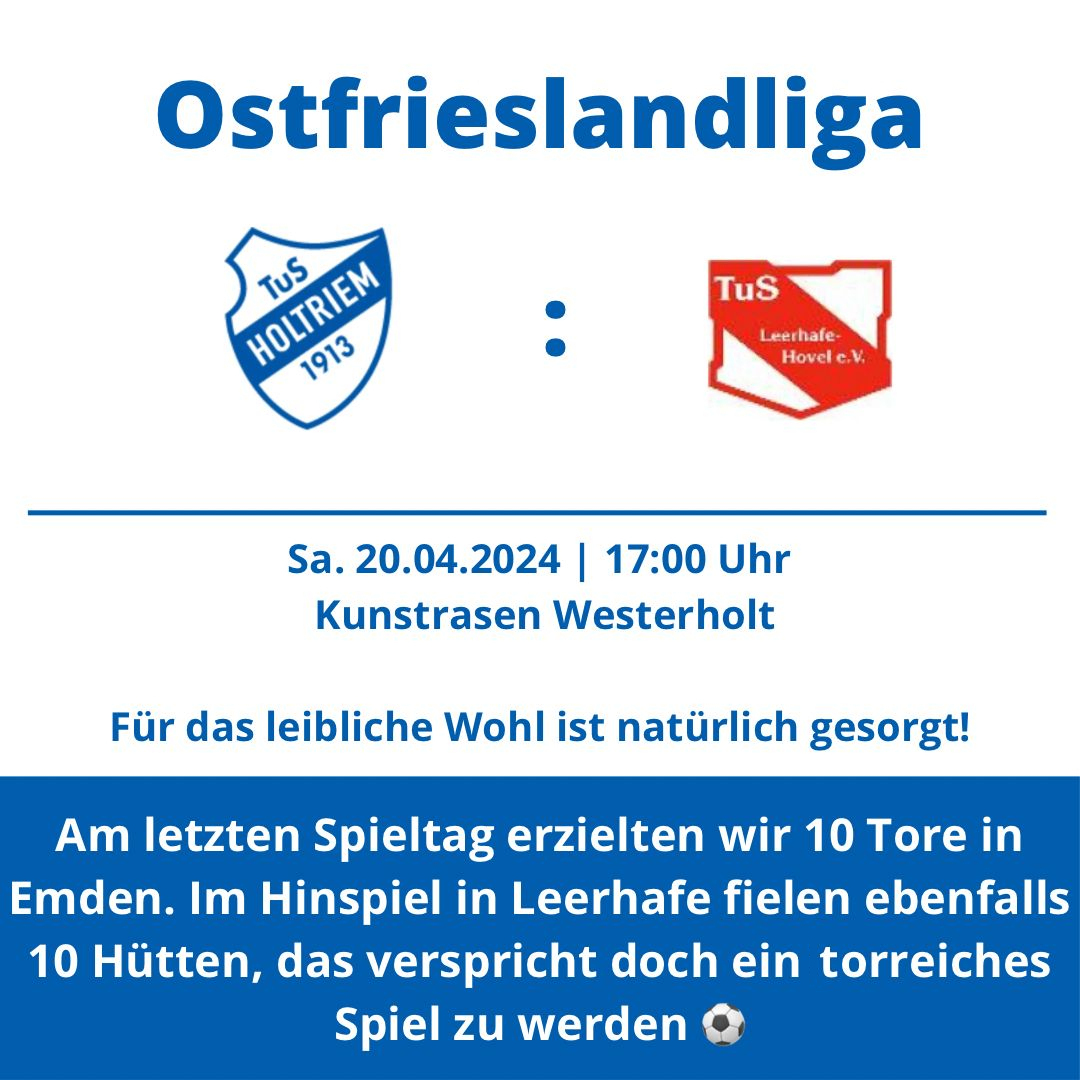 Im Hinspiel konnte sich der TuS Holtriem beim Aufsteiger aus Leerhafe-Hovel mit 7:3 durchsetzen. Im Rückspiel könnten ebenfalls viele Tore fallen, denn mit Pascal Menken und Thorsten Lettau stehen die mit Abstand besten Knipser der Ostfrieslandliga auf dem Platz. Und dass unsere Jungs auch ohne Thorsten Tore schießen können, haben sie in Emden eindrucksvoll bewiesen.