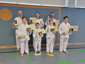 Davon ist eine mit Auszeichnung; denn Frederic Stuhr, der erst kurz dabei ist, aber alles super gemacht hat, hat einen Kyu übersprungen und somit jetzt den 4. Kyu.
